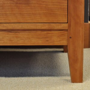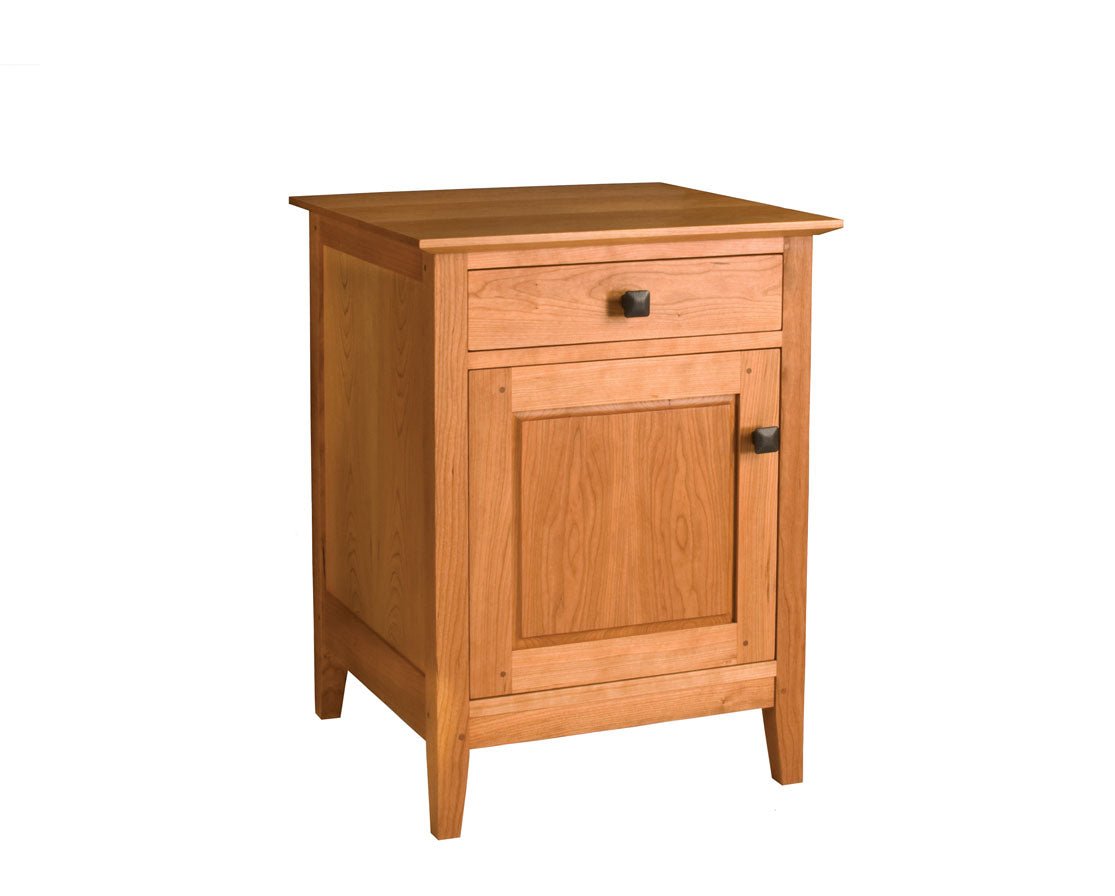 The Dunning Nightstand is inspired by Mission design. This solid wood nightstand features a heavy overhang at the top with an elongated bevel, through finger joints on the top drawer, and traditional frame-and-panel door construction. Handcrafted in Portland, Oregon using sustainably harvested hardwoods.