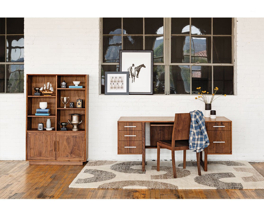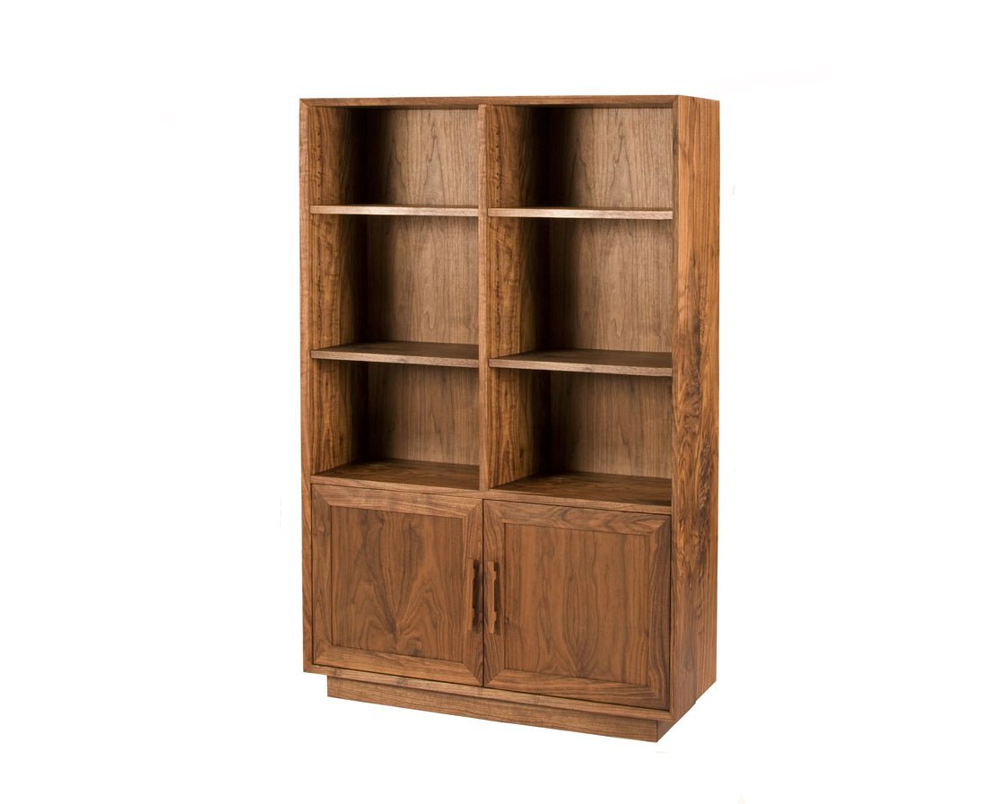 The Modern Avocat Bookcase features four adjustable shelves in the upper open shelf area, and two adjustable shelves behind the doors. Similarly to the other Modern lines by The Joinery, this piece features mitered edges with a 45 degree bevel and plinth base.