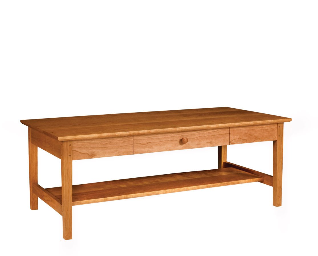 The classic design of the Shaker coffee table allow it to work in a range of rooms. It features simple straight legs, dovetail drawer with Shaker wood knob, and a slight bevel to the top detail.