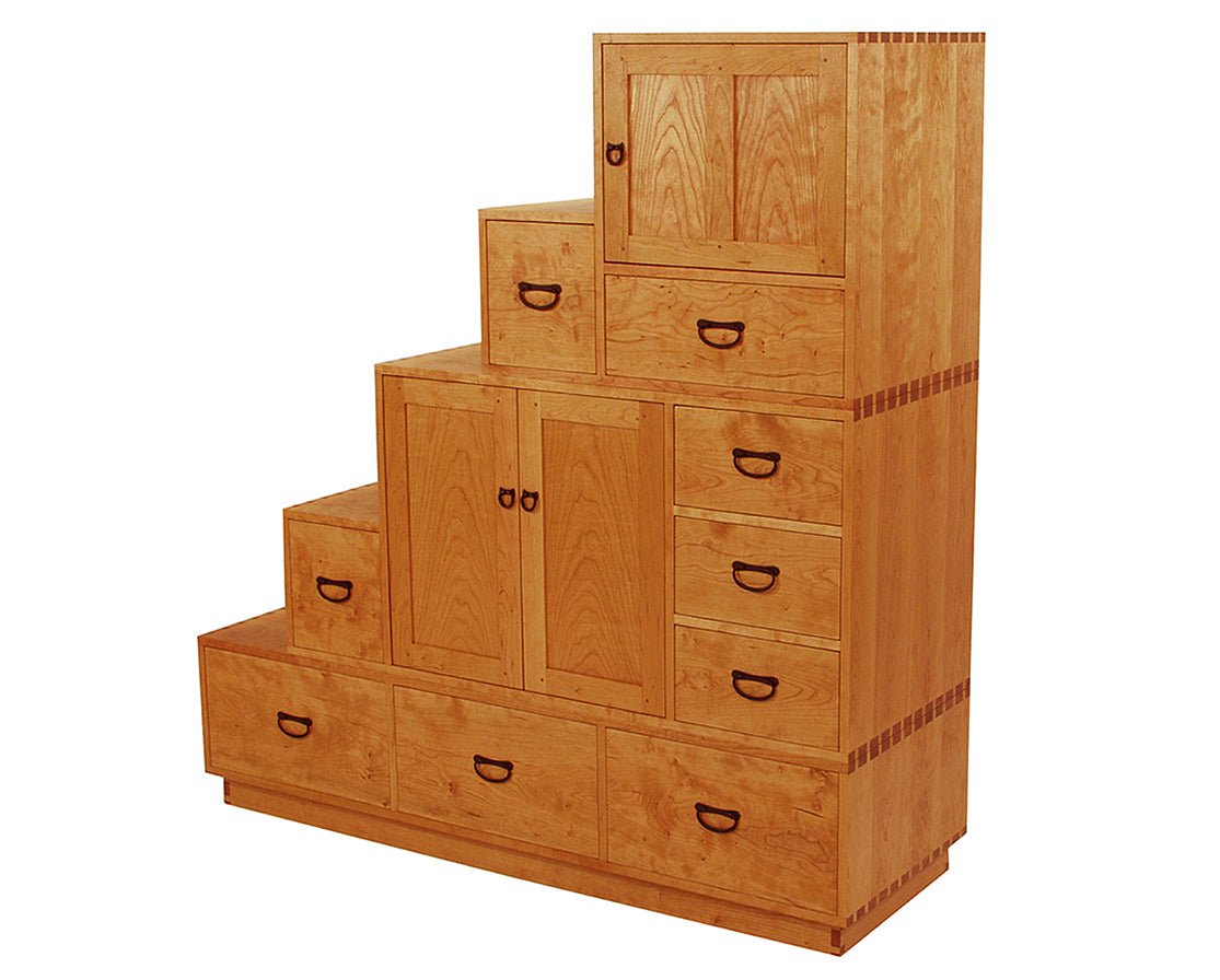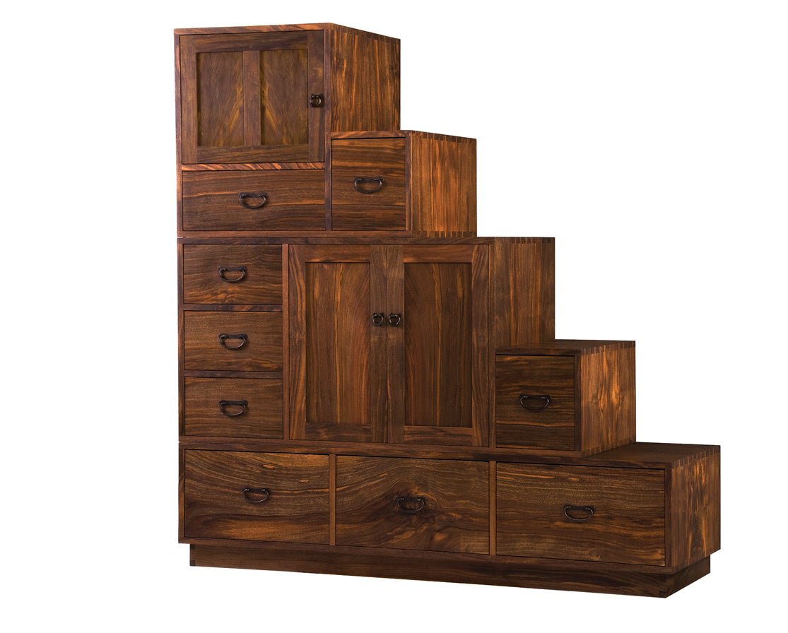 The Joinery Tansu cabinet is inspired by traditional Japanese Tansu cabinets that are built with lots of tiny compartments in the shape of a stair case. This piece can be made either right or left facing to allow for the perfect shape for your space. The pulls that come on this piece are hand forged and blackened.?